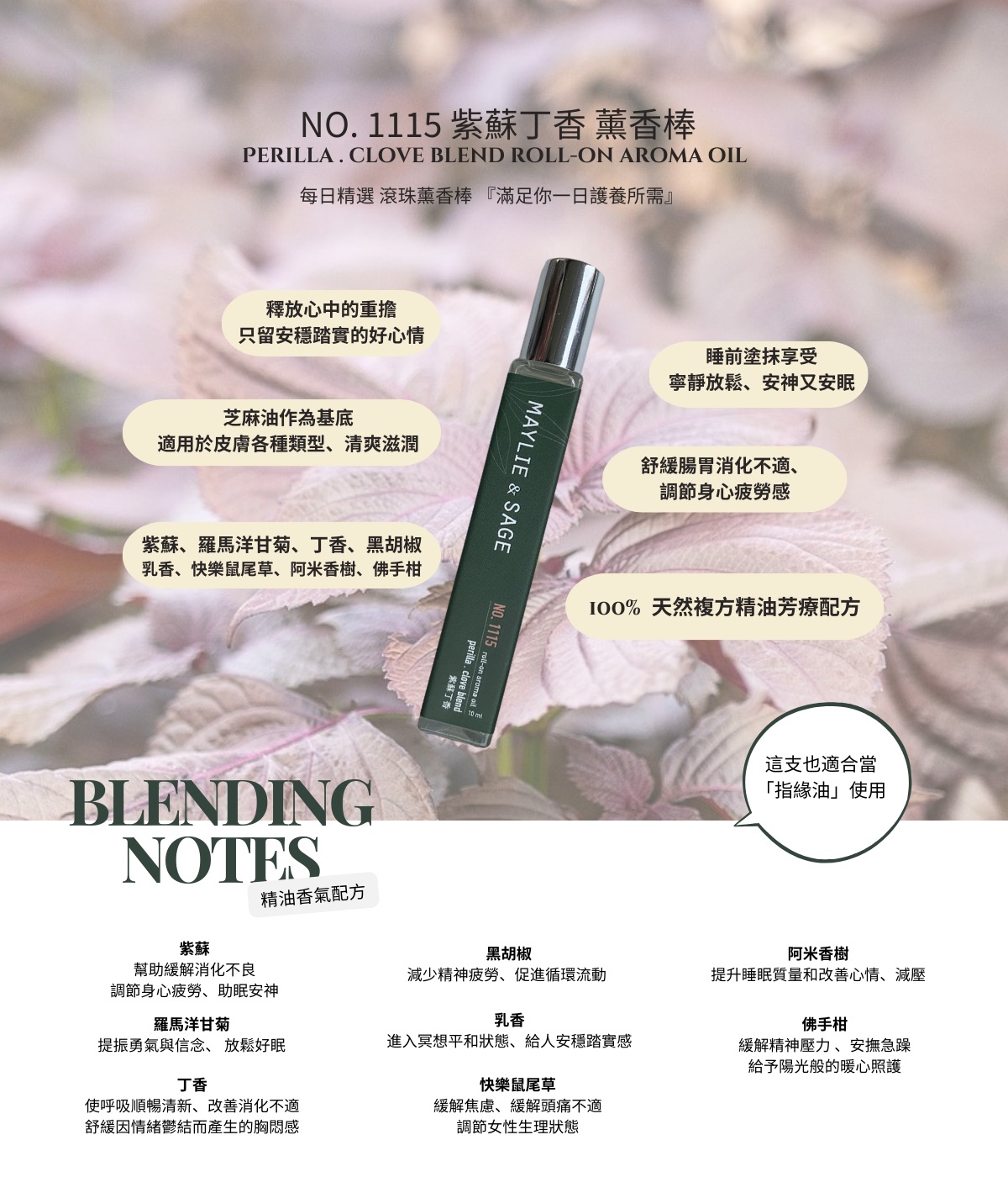*複方薰香精油: 以紫蘇、羅馬洋甘菊、丁香、黑胡椒、乳香 、快樂鼠尾草、阿米香樹、佛手柑調製而成