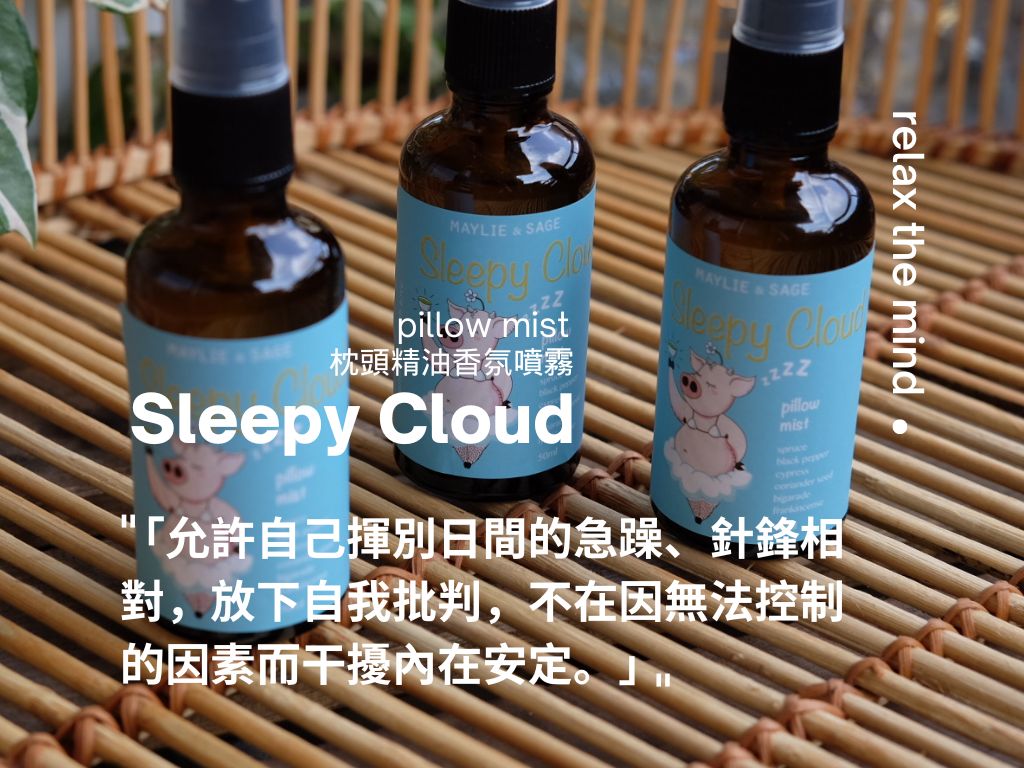 "Sleepy Cloud" 雲朵輕輕枕頭精油香氛噴霧融合乳香、黑胡椒、苦橙葉與黑雲杉等多種精油交織而成。起初帶有點皮革煙燻味,述說只想一人靜靜的需求,